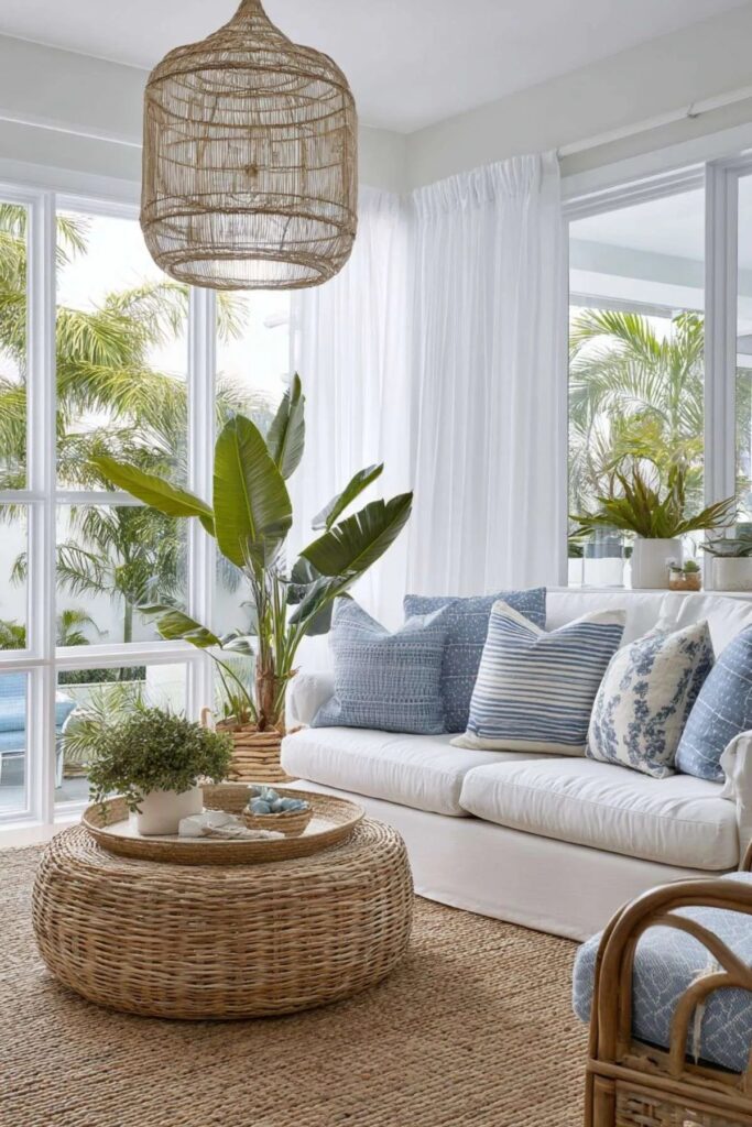 Coastal boho decor is all about merging the laid-back feel of beach life with the artistic, free-spirited vibes of bohemian design. This style often features:
